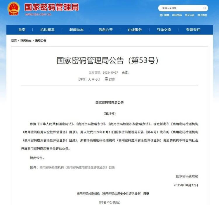 近日,國(guó)家密碼管理局發(fā)布《國(guó)家密碼管理局公告(第53號(hào))》,公布最新《商用密碼檢測(cè)機(jī)構(gòu)(商用密碼應(yīng)用安全性評(píng)估業(yè)務(wù))目錄》,盛通檢測(cè)持續(xù)入選該目錄。