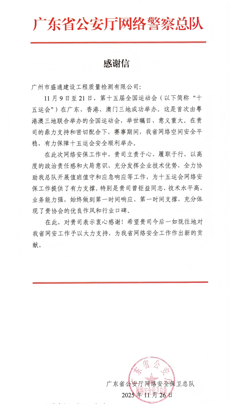 近日,盛通檢測獲得來自廣東省公安廳網(wǎng)警總隊的表彰,省網(wǎng)警總隊對公司在第十五屆全運會期間提供的網(wǎng)絡(luò)安全保障支持給予了高度肯定,為賽事期間我省網(wǎng)絡(luò)空間的安全平穩(wěn)提供了有力支撐。